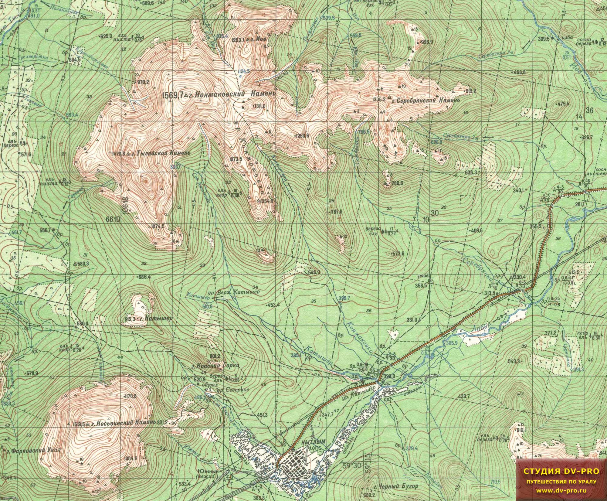 Подъем на Конжаковский КаменьЧерез 500 метров дорога, довольно каменистая, стала немного забирать вверх. Мы договорились, что в два часа сделаем привал и пообедаем. Пересекли две речушки, линию электропередачи. Навстречу нам попалась целая семья с детьми, идущая назад к дороге, младший сидел у папы на шее. На обочине сидели двое туристов, отдыхали. Так что было понятно, Конжак - место популярное. Тропа и правда была отмечена красными ленточками на деревьях и кустах, каждый километр стояли знаки: 2, 3, 4... Вот на четвертом километре мы и пообедали чебуреками и овощами, чуть отдохнули и пошли дальше. Причем Саша надел комбинезон и кофту, побрызгал ноги от комаров - насекомые уже пробовали нас на вкус. Еще через полкилометра дорога пошла вниз, и никаких признаков гор. Александр уже засомневался - туда ли мы идем. Но вот путь снова повел наверх и в просвет над деревьями мы вдруг увидели в вышине здоровенный синеватый Конжаковский Камень, как теперь ясно - одно из его предгорий. Мы обрадовано двинули дальше. А идти становилось все труднее: время - самая жара, на дороге тени нет, рюкзаки тяжелеют. А у меня еще у кроссовок оказалась довольно тонкая подошва, так что наступать на камни было очень чувствительно, получился такой жесткий массаж стоп. Отсюда вывод - в такие походы надо надевать обувь на толстой подошве, желательно берцы. Пыхтели мы, пыхтели, вдруг дорога раздвоилась - одна часть прямо и наверх, другая налево, там был построен навес и большой стол. Незаметный указатель гласил, что Конжак налево, а прямо - Серебрянский Камень. Мы повернули, и дорога стала тенистой, зато все круче и круче. До 6-го км. мы еле доплелись, сделали привал на полянке, посидели на чурбачках, попили воды. Я на всякий случай замотала ломаную ногу эластичным бинтом. Двинулись мы дальше, вдруг запахло гарью, и справа от тропы потянулся подпаленный лес с выгоревшим подлеском. Пни местами еще дымились. Посмотрели мы наверх - а там просто столб дыма - лес горит метров на 700-800 выше по склону. Призадумались, как будем возвращаться, если все разгорится, но все-таки решили идти вперед - нам же не к пожару, а мимо. Через некоторое время дорога кончилась. На поляне стоял вишневый "Жигуленок" и никого рядом не было. А в лес уходила узкая тропинка - местами земляная, местами каменистая. И сам лес очень изменился: то по бокам были непроходимые дебри из мелких тощих елок, а тут ели стали крупные и простора больше. Мы шли уже довольно долго, а знака "7-й км" все не было. Вдруг показался сразу 8-й. Видимо, предыдущий просто упал. Мы уже порядком устали, хотели пить. Тут впереди послышался какой-то шум, думали - ветер, оказалось - горная речка Конжаковка. Она весело бежала по каменному руслу, через нее был перекинут мост из трех сосновых бревен, скрепленных железными скобами. Мы обрадовались речке, как родной. Перешли мост, скинули рюкзаки, разделись и пошли купаться в студеной водичке. И еще мы ее пили - замечательно вкусная. Потом мы еще фотографировались, осмотрели стоянку - там на бережку и скамейки самодельные поставлены, и стол, и место есть для палаток. Сил после купания у нас прибавилось. Не хотелось уходить от горной речки, но надо было двигаться дальше. Тропинка, пробежав немного вдоль берега, сворачивала в лес. Она вся была покрыта переплетенными корнями, в основном, еловыми. Какая-то птица с большим кл